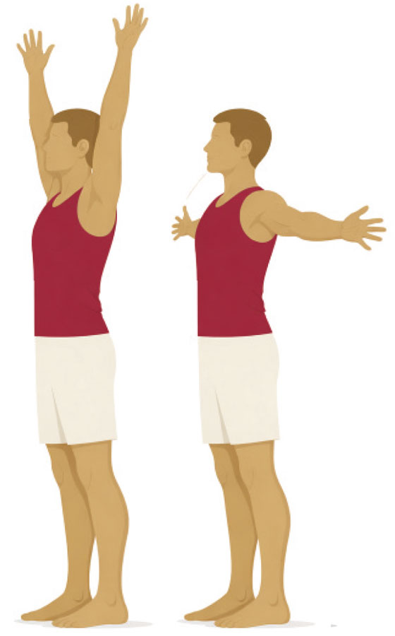 Strecken Sie beide Arme nach oben und führen Sie sie auf Schulterhöhe nach hinten. Das löst Verspannungen und versorgt das Gehirn mit frischem Sauerstoff.