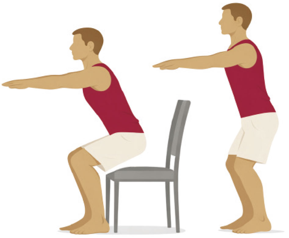 Gehen Sie in die Hocke, als würden Sie sich setzen, stoppen Sie knapp über dem Stuhl und stehen Sie wieder auf – fünfmal wiederholen. Der Fettstoffwechsel wird angekurbelt und der Blutzuckerspiegel reguliert.