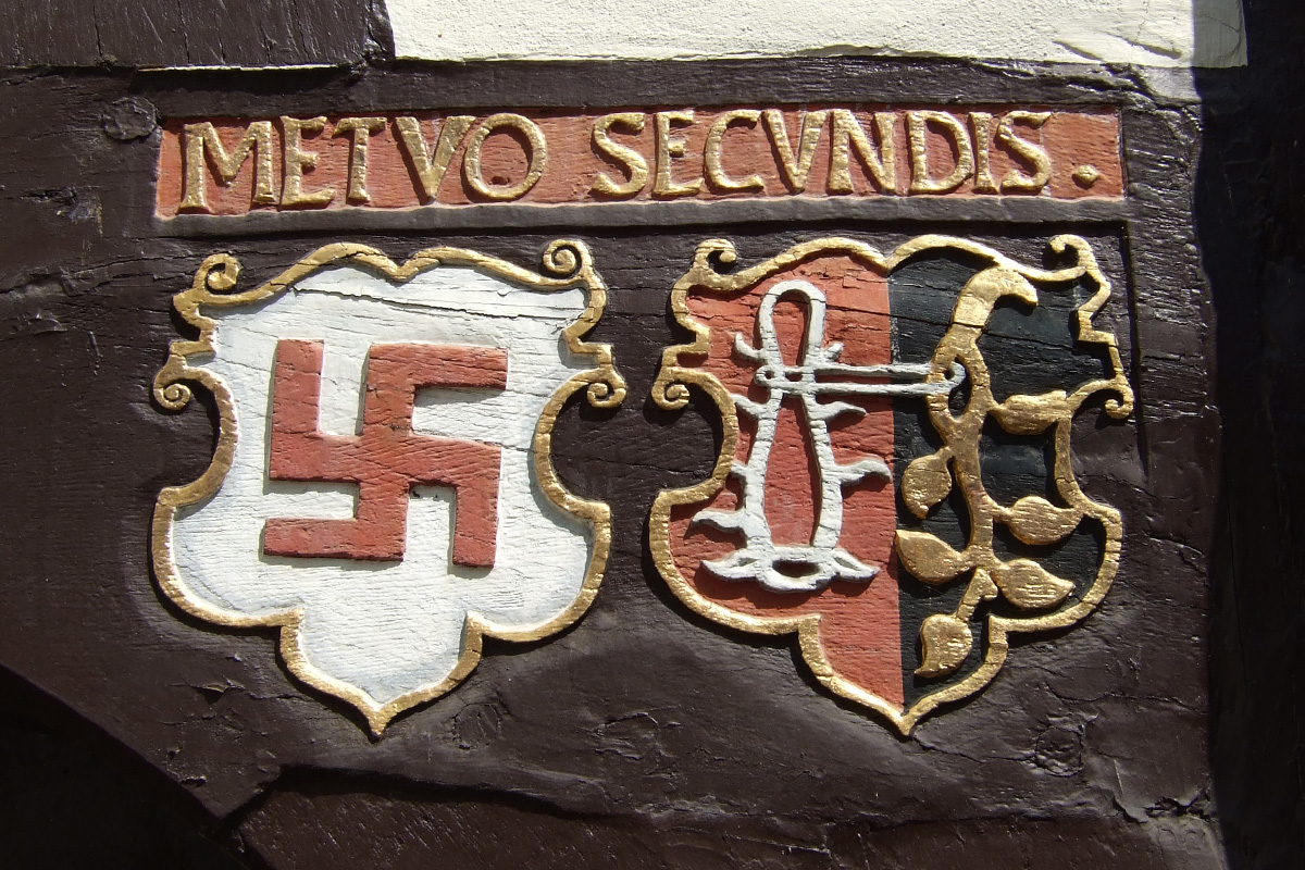 Auffällig ist für jeden Besucher das sog. Hakenkreuz, das sich mehrmals am Haus befindet. Es war das Wappen der Familie Raven, einer Patrizierfamilie, die vom 15. bis 17. Jahrhundert in Einbeck viel Grundbesitz hatte und mehrere Bürgermeister stellte. Das Wappen ist auch in den beiden alten Kirchen Einbecks zu finden.